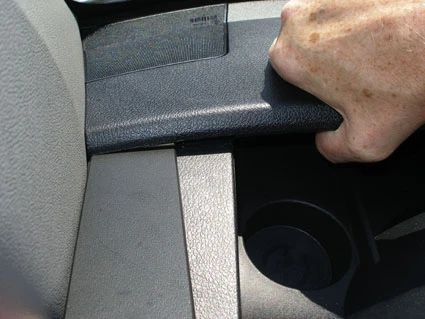 Peel off the adhesive tape covers on the ProClip. Grab a hold of the dashboard overhang and pull it upwards, in the same time hook the angled edge on the upper part of the ProClip behind the panel under the the dashboard overhang.