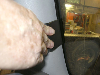 Peel off the adhesive tape covers on the ProClip. Pull out the rubber covering the panel and hook the angled edge on the left part of the ProClip over the panel edge. Push the rubber back in place.