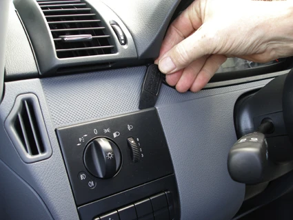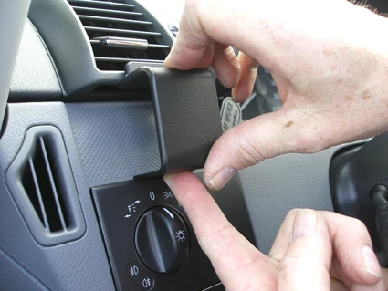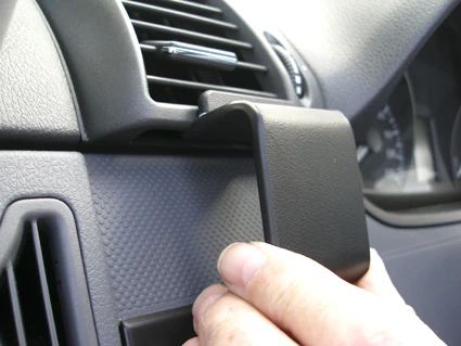 Press the grooved edge on the upper part of the ProClip into the gap between the frame surrounding the air vent and the dashboard. Press until you hear/feel it snaps into place.