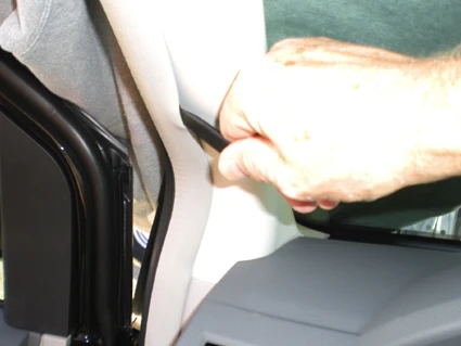 Press firmly upwards with your left hand on the bottom part of the ProClip and leftward on the right side of the ProClip with your other hand. Press until you see or hear/feel the angled edge on the upper part of the ProClip snap around the A-post panel edge.
