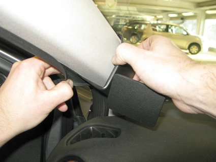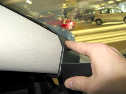 Press the upper part of the ProClip upward and leftward so the angled edge hooks around the A-post by the windshield. Press until you see or hear/feel the angled edge on the upper part of the ProClip snap around the A-post panel edge.