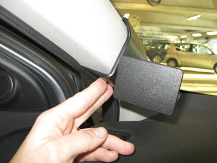 Peel off the cover of adhesive tape on the ProClip. Pull/flip the rubber sealant by the A-post open. Insert the angled edge on the lower part of the ProClip under the rubber sealent and hook it behind the A-post panel edge.