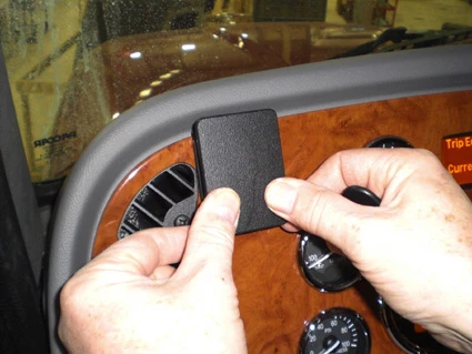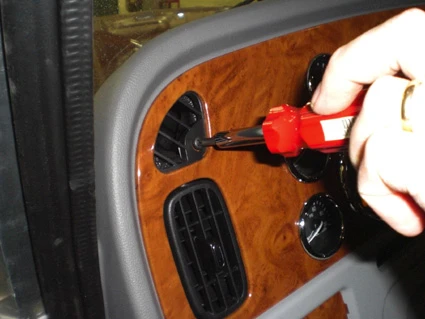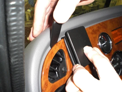 Peel off the cover of adhesive tape on the ProClip. Press the thin end of the enclosed gap opener behind the wood grain panel. Then press forward on the upper part of the gap opener to bend the wood grain panel out. Hook the angled edge on the upper part of the ProClip over the wood grain panel edge. Pull out the gap opener.
