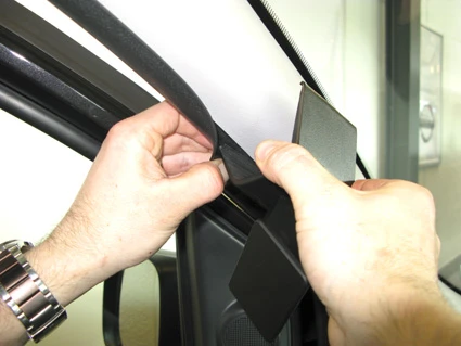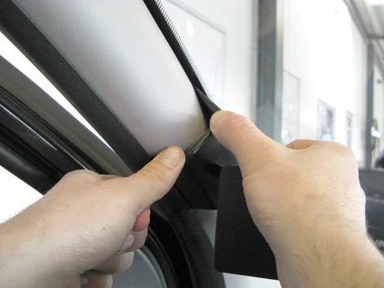 Pull out the rubber sealent by the A-post slightly. Hook the angled edge on the lower part of the ProClip behind the A-post, under the rubber sealent.