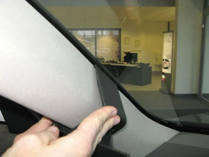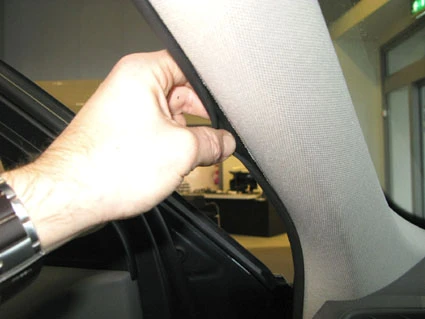Use the enclosed alcohol pad to clean the area where the ProClip is to be installed. Peel off the adhesive tape covers on the ProClip. Pull out the rubber sealent on the A-post to widen the gap slightly.