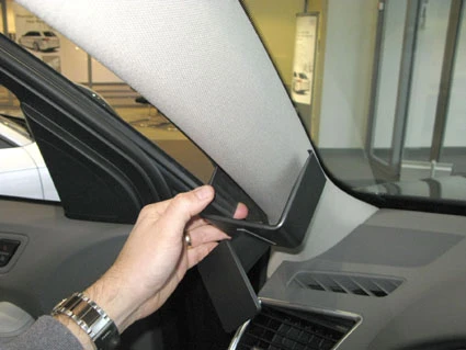 Press the ProClip upward/leftward so the angled upper edge hooks around the A-post by the windshield.