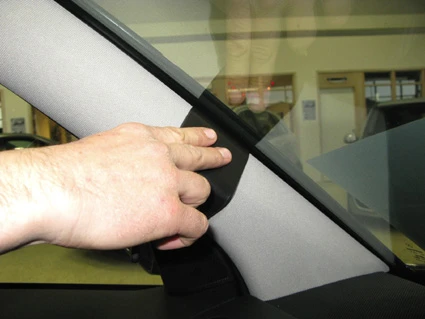 Press the ProClip upward/leftward so the angled edge hooks over the A-post by the windshield.