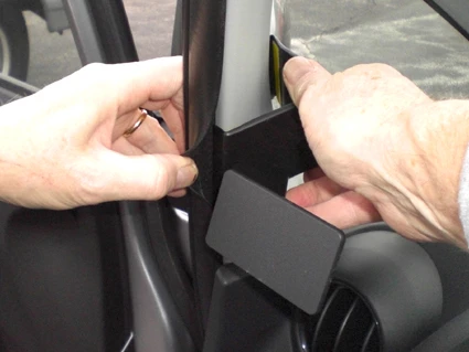 Press firmly upwards with your left hand on the bottom part of the ProClip and leftward on the right side of the ProClip with your other hand. Press until you see or hear/feel the angled edge on the upper part of the ProClip hook around the A-post panel edge.