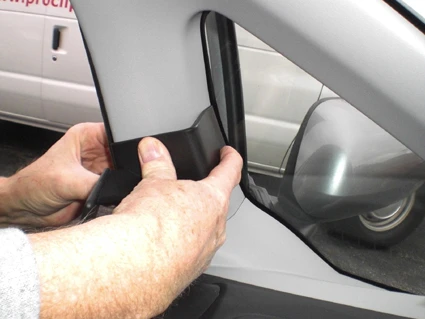 Peel off the cover of adhesive tape on the ProClip. Press your thumb into the gap between the A-post panel frame and the rubber sealant, to widen the gap. Insert the angled edge on the lower part of the ProClip into the gap and hook it behind the A-post panel edge.