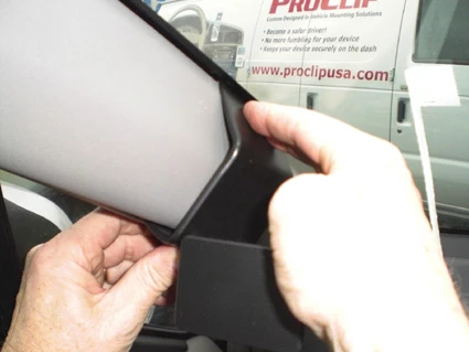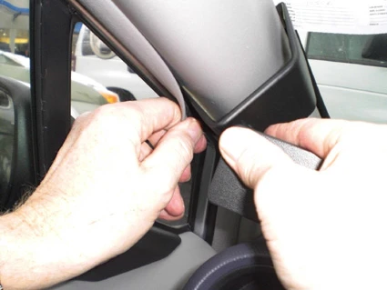 Press firmly upwards with your left hand on the bottom part of the ProClip and leftward on the right side of the ProClip with your other hand. Press until you see or hear/feel the angled edge on the upper part of the ProClip hook around the A-post panel edge.