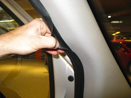 Use the enclosed alcohol pad to clean the area where the ProClip is to be installed. Peel off the adhesive tape covers on the ProClip. Press your thumb into the gap between the A-post panel frame and the rubber sealant, to widen the gap.