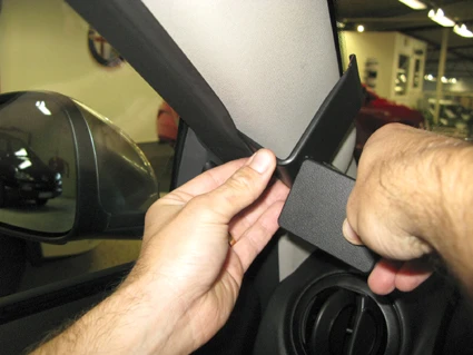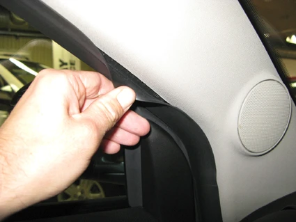 Insert the angled edge on the lower part of the ProClip into the gap and hook it behind the A-post panel edge.