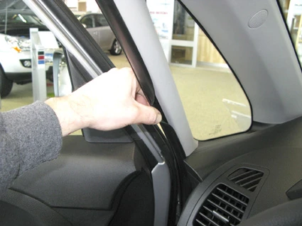 Use the enclosed alcohol pad to clean the area where the ProClip is to be installed. Peel off the adhesive tape cover on the ProClip. Pull out the rubber sealent on the A-post slightly, to widen the gap.