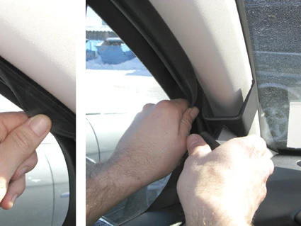 Use the enclosed alcohol pad to clean the area where the ProClip is to be installed. Peel off the adhesive tape cover on the ProClip. Pull out the rubber sealent on the A-post slightly, to widen the gap. Press the angled edge on the lower part of the ProClip into the gap and hook it behind the A-post.