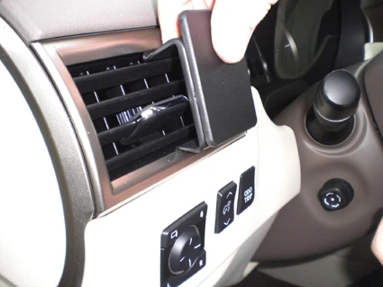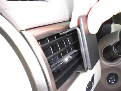 Use the enclosed alcohol pad to clean the area where the ProClip is to be installed. Peel off the cover of adhesive tape on the ProClip. Press the thin angled edge on the lower part of the ProClip into the seam/gap between the air vent and the surrounding panel frame.