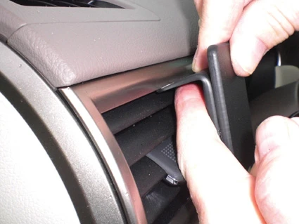 Press firmly down on top of the ProClip so it flexes downward. Then hook it into the seam/gap between the air vent and the surrounding panel frame. Note: While the ProClip is in the air vent, you may have to wiggle and pull a little to get the angled edge to go into the seam/gap.