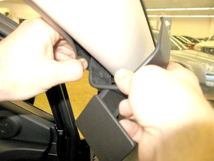 Pull out the rubber sealent on the A-post slightly. Press the angled edge on the lower part of the ProClip into the gap and hook it around the A-post.