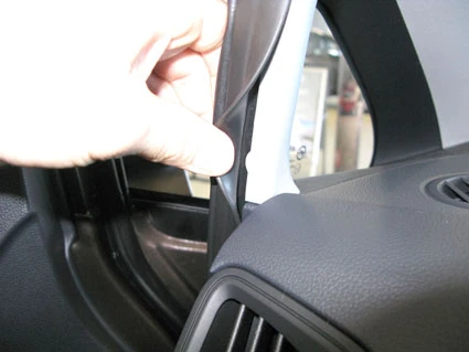 Press the ProClip upward/forward so the angled upper part hooks around the A-post. Press until you hear/feel it snaps into place.