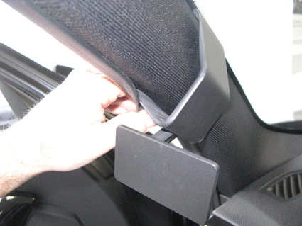 Press the ProClip upward/forward so the angled upepr edge hooks around the A-post. Press/Slide the ProClip downward until it is firmly in place.