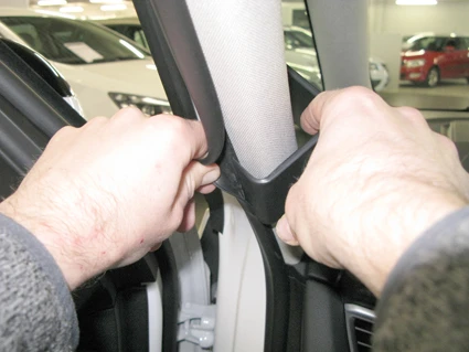 Press the ProClip upward/forward so the angled upepr edge hooks around the A-post. Press down on top of the ProClip so the angled edge is properly in place.