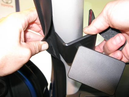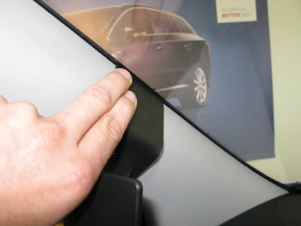 Use the enclosed alcohol pad to clean the area where the ProClip is to be installed. Peel off the adhesive tape covers on the ProClip. Pull out the rubber sealent on the A-post slightly.