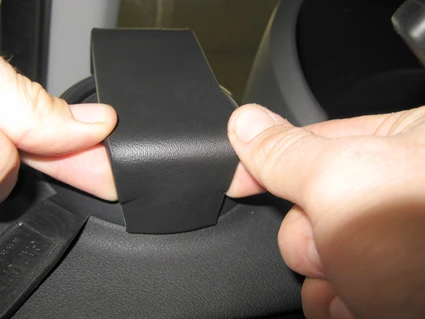 Use the enclosed alcohol pad to clean the area where the ProClip is to be installed. Press the thin end of the enclosed gap opener into the gap between the frame surrounding the air vent and the dashboard, to widen the gap obliquely above the air vent. Peel off the adhesive tape covers on the ProClip. Press/Hook the angled edge on the upper part of the ProClip into the gap next to the gap opener. Press downward on top of the ProClip so all of the the curved angled edge goes all the way into the gap. Pull out the gap opener.