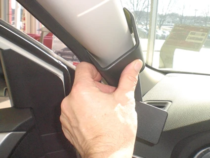 Press the ProClip upward/forward so the angled upper edge hooks around the A-post by the windshield. Press down on top of the ProClip so the angled edge hooks properly into place.