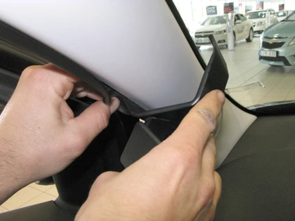 Press the angled edge on the lower part of the ProClip into the gap and hook it around the A-post.