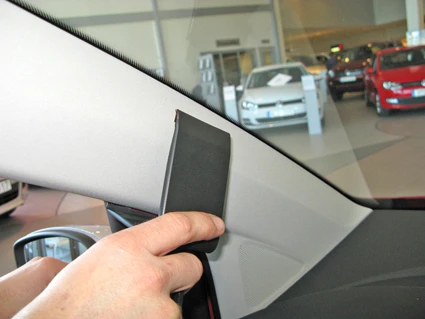 Press the ProClip upward/forward so the angled upper edge hooks around the A-post.