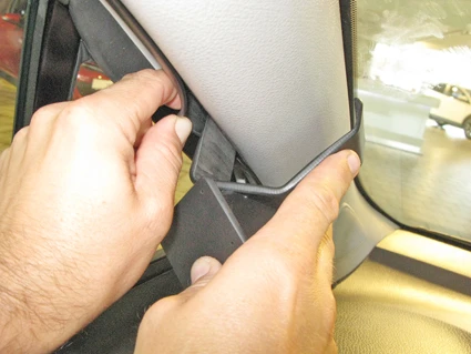 Use the enclosed alcohol pad to clean the area where the ProClip is to be installed. Pull out the rubber sealent on the A-post slightly. Remove the adhesive tape covers on the ProClip. Press the angled edge on the lower part of the ProClip into the gap and hook it around the A-post.