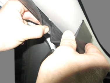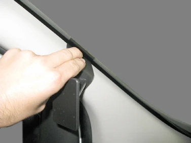 Pull out the rubber sealent on the A-post slightly. Press the angled edge on the lower part of the ProClip into the gap and hook it around the A-post.