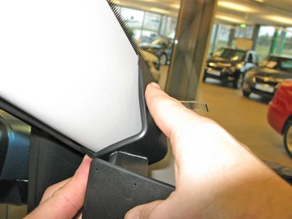 Press the ProClip forward so the angled upper edge hooks into the gap between the windshield and the A-post. Press down on top of the ProClip so the adhesive tape attaches.