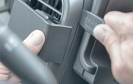 Press the gap opener into the right gap between the frame surrounding the air vent and the dash, to widen the gap. Press the angled right edge of the ProClip into the gap next to the gap opener. Remove the gap opener.