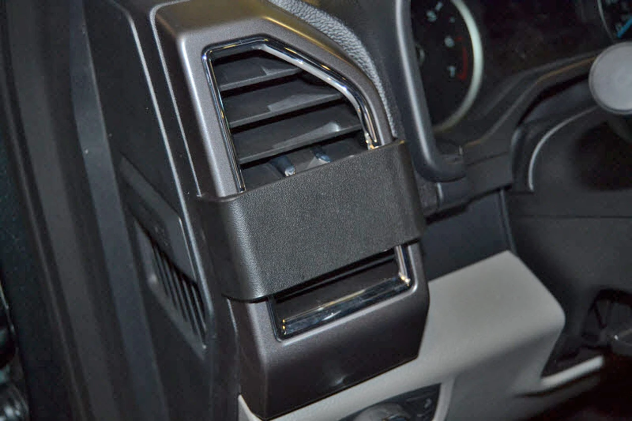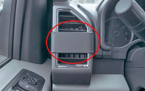 Use the enclosed alcohol pad to clean the area where the ProClip is to be installed. Press the enclosed gap opener into the gap between the left side of the frame surrounding the air vent and the dash, to widen the gap. Remove the adhesive tape cover on the ProClip. Press the angled left edge of the ProClip into the gap next to the gap opener. Remove the gap opener.