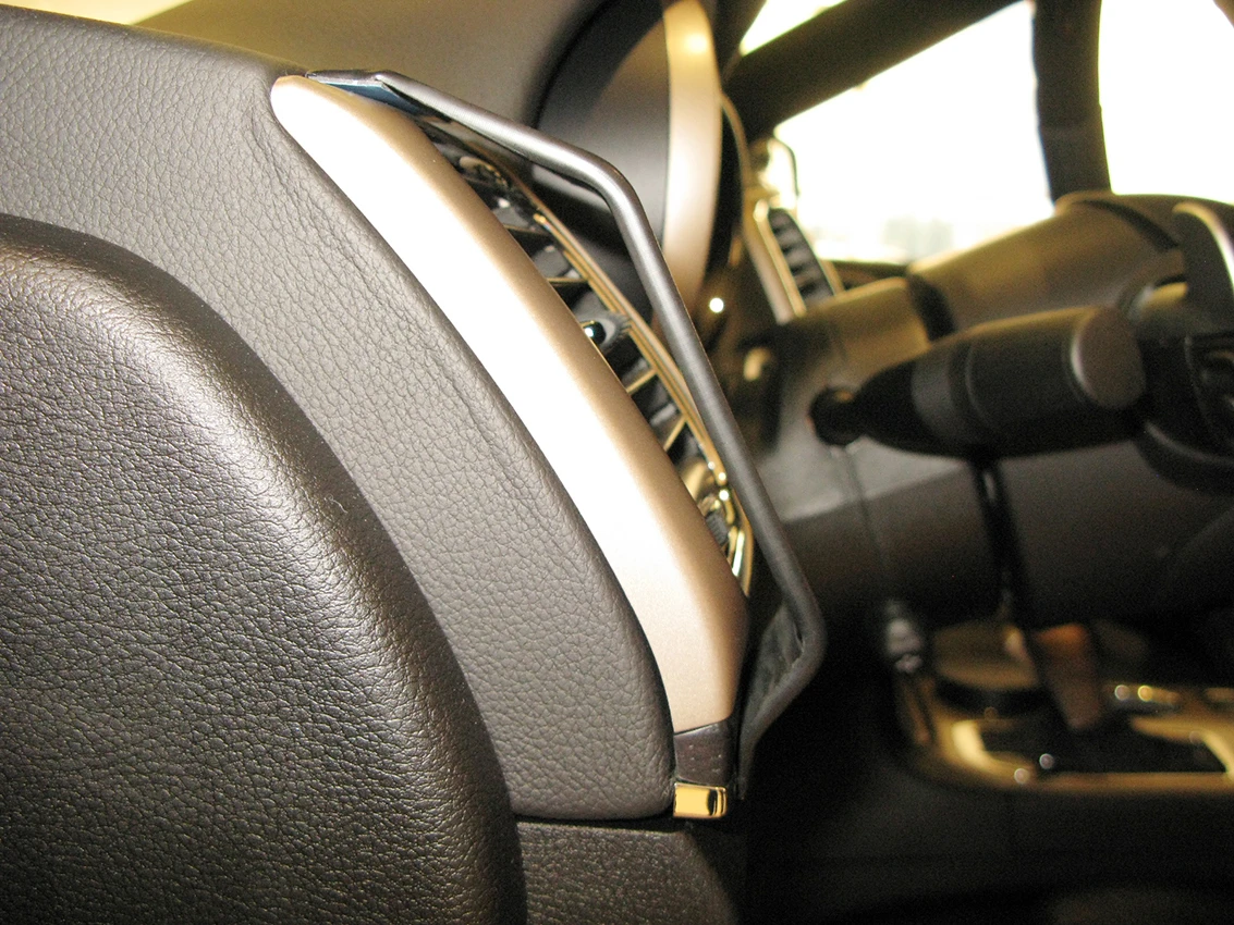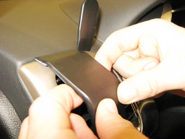 Use the enclosed alcohol pad to clean the area where the ProClip is to be installed. Remove the adhesive tape covers on the ProClip. Press the angled lower edge of the ProClip into the gap between the frame surronding the air vent and the dashboard.