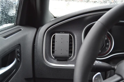 Use the enclosed alcohol pad to clean the area where the ProClip is to be installed. Peel off the adhesive tape cover on the ProClip. Press the angled edge on the lower part of the ProClip into the gap between the air vent dial and the surrounding frame.