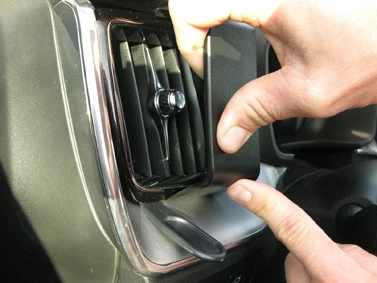 Press the gap opener into the gap between the dashboard and the frame surrounding the air vent. Hook the angled edge on the upper part of the ProClip into the gap next to the gap opener. Pull out the gap opener.
