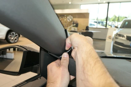 Press the ProClip upward/forward so the angled upper edge hooks around the A-post.
