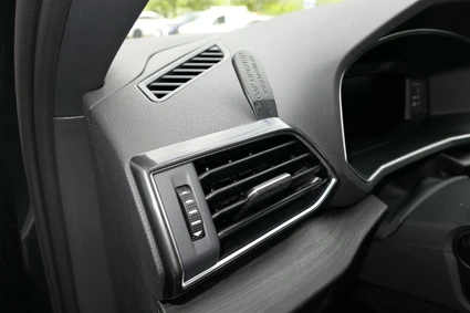 Press a corner of the angled edge on the lower part of the ProClip into the gap between the frame surrounding the air vent and the dashboard. Then press all of the angled lower edge into the gap.