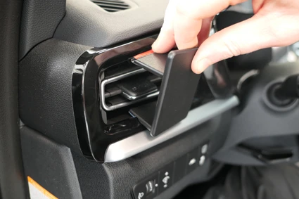 Press the upper part of the ProClip forward so the grooved edge snaps under the frame surrounding the air vent.