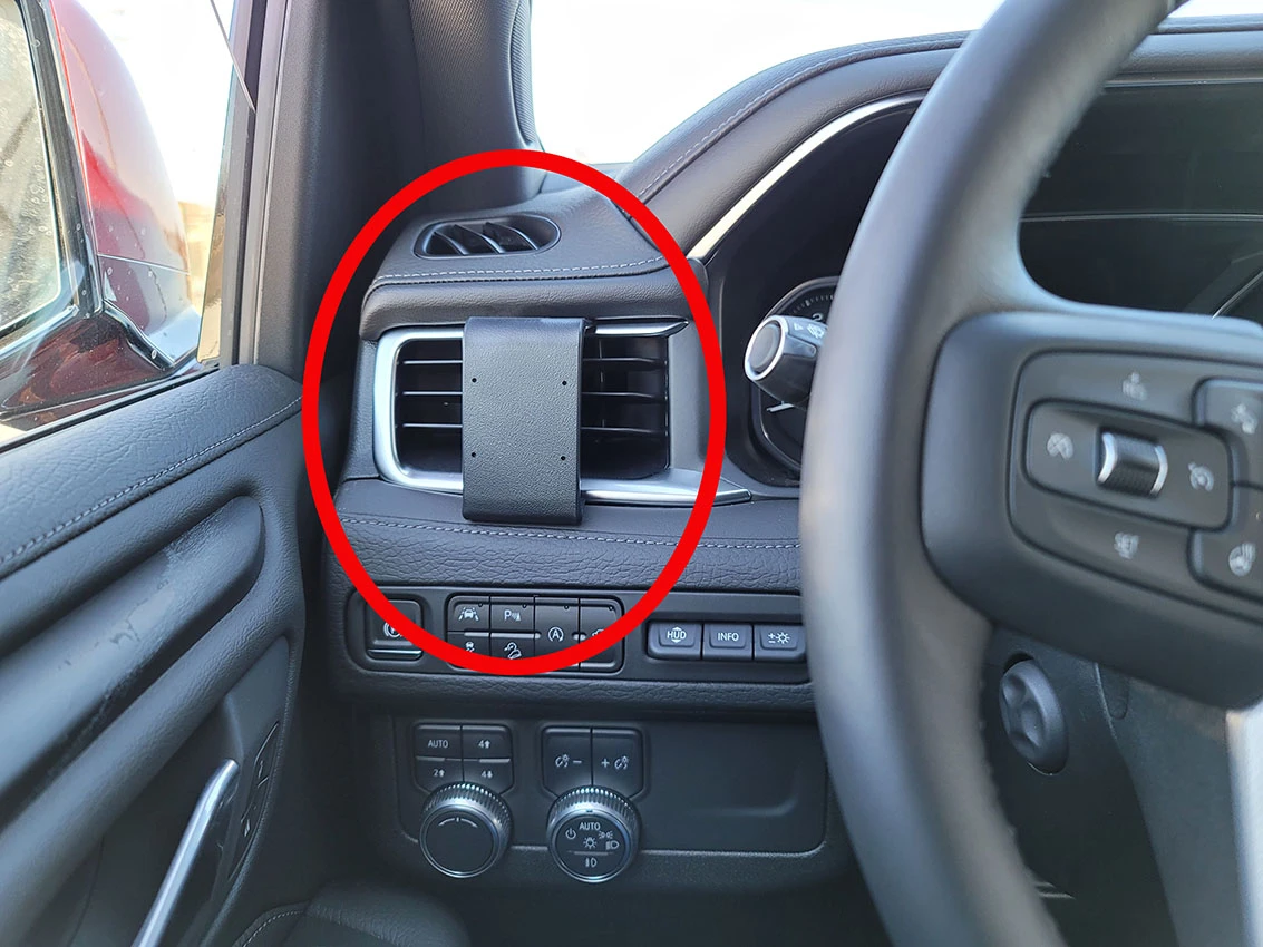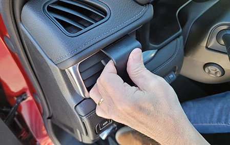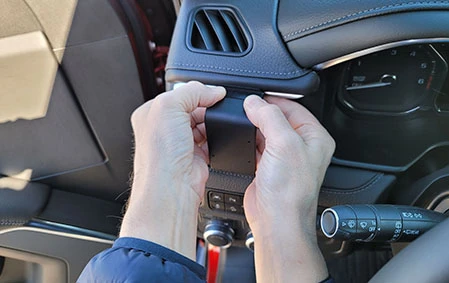 Press the upper part of the ProClip downward/forward and hook the angled upper edge into the gap between the frame surrounding the air vent and the dashboard.