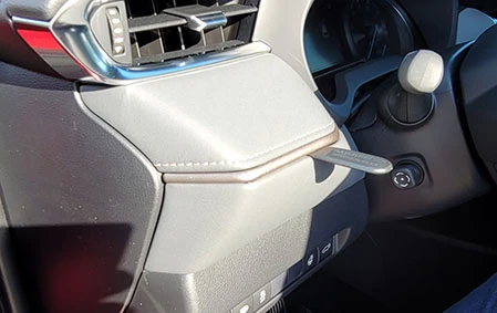 Press the thin ned of the enclosed gap opener into the gap between the trim and the dashboard, to widen the gap. Use the enclosed alcohol pad to clean the area where the ProClip is to be installed. Peel off the adhesive tape covers on the ProClip.