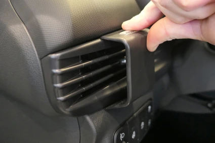 Hook the angled upper edge of tthe ProClip into the gap between the frame surrounding the air vent and the dashboard. Press down on top of the ProClip so the angled upper edge goes all the way into the gap.