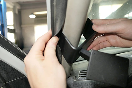 Use the enclosed alcohol pad to clean the area where the mount is to be installed. Peel off the adhesive tape cover. Pull out the rubber sealent on the A-post. Press the lower part of the mount into the gap and hook it behind the A-post.