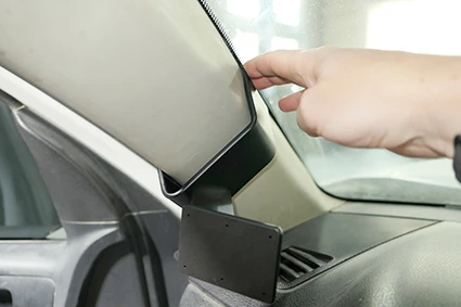 Press the mount forward/upward so the angled upper edge hooks around the A-post.
