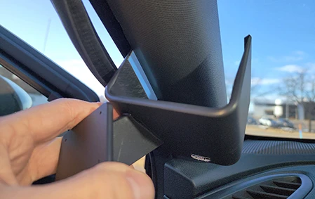 Peel off the adhesive tape covers from the mount. Carefully pull the rubber sealant out of the A-pillar where the mount will install. Press the angled edge on the lower part of the mount into the outer gap and hook it around the A-pillar.