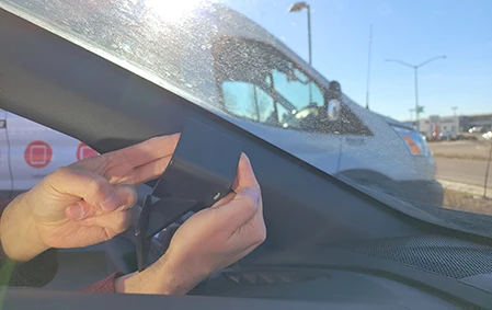 Flex the mount upward and forward, so the upper angled edge hooks around the A-pillar by the windshield.