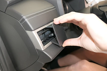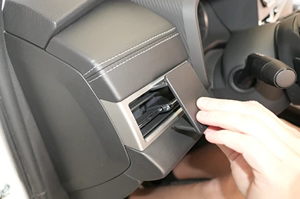 Use the enclosed alcohol pad to clean the area where the ProClip is to be installed. Peel off the adhesive tape covers on the ProClip. Hook the upper edge of the ProClip under the frame surrounding the air vent.