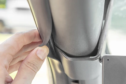 Use the enclosed alcohol pad to clean the area where the mount is to be installed. Peel off the adhesive tape covers. Pull out the rubber sealent on the A-post slightly. Align the bottom edge of the mount with the top of the air vent by the left hand side.