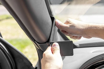 Press the left part of the mount into the gap and hook it behind the A-post. Make sure the bottom edge of the mount with the top of the air vent by the left hand side.